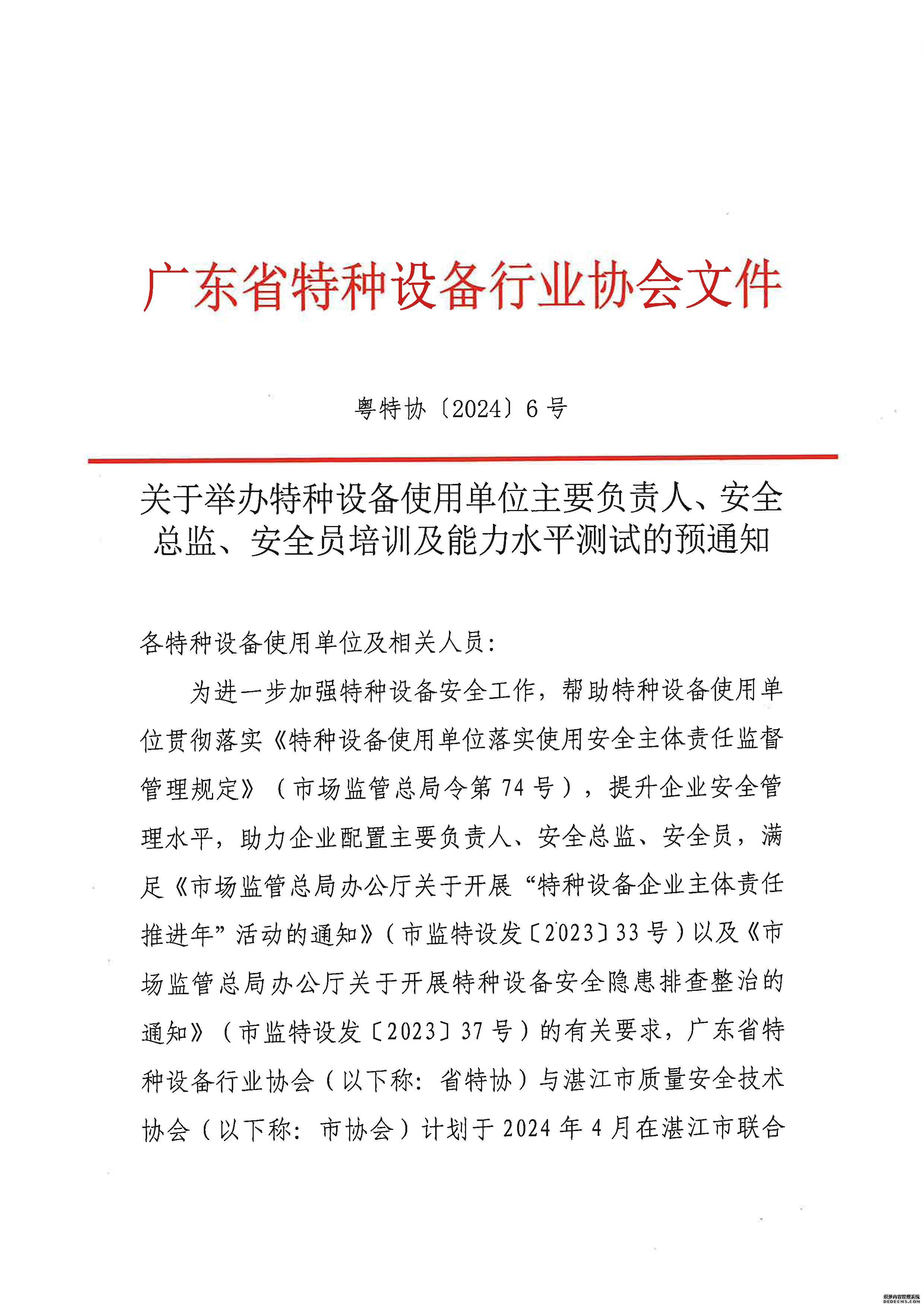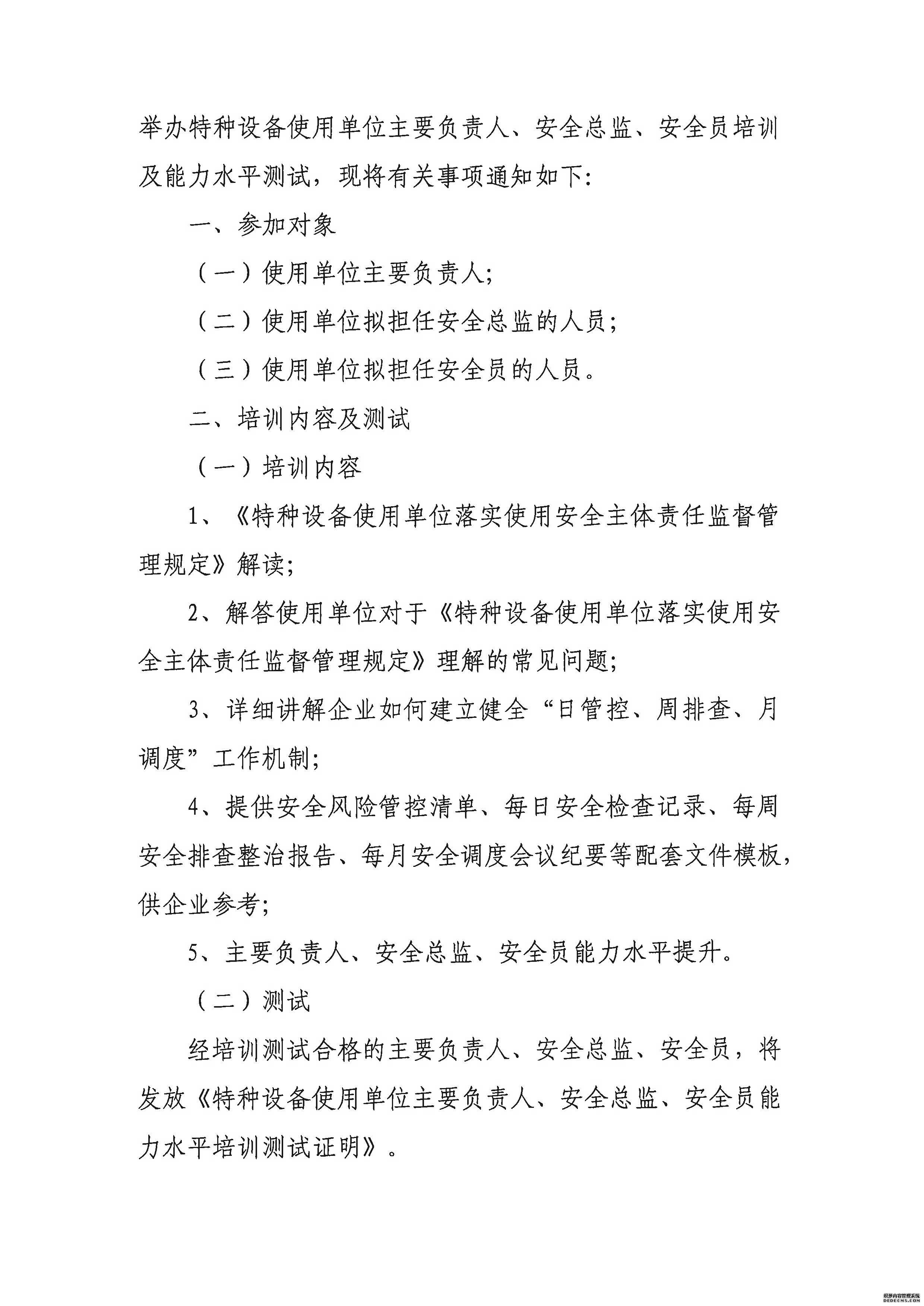 关于举办特种设备使用单位主要负责人、安全总监、安全员培训及能